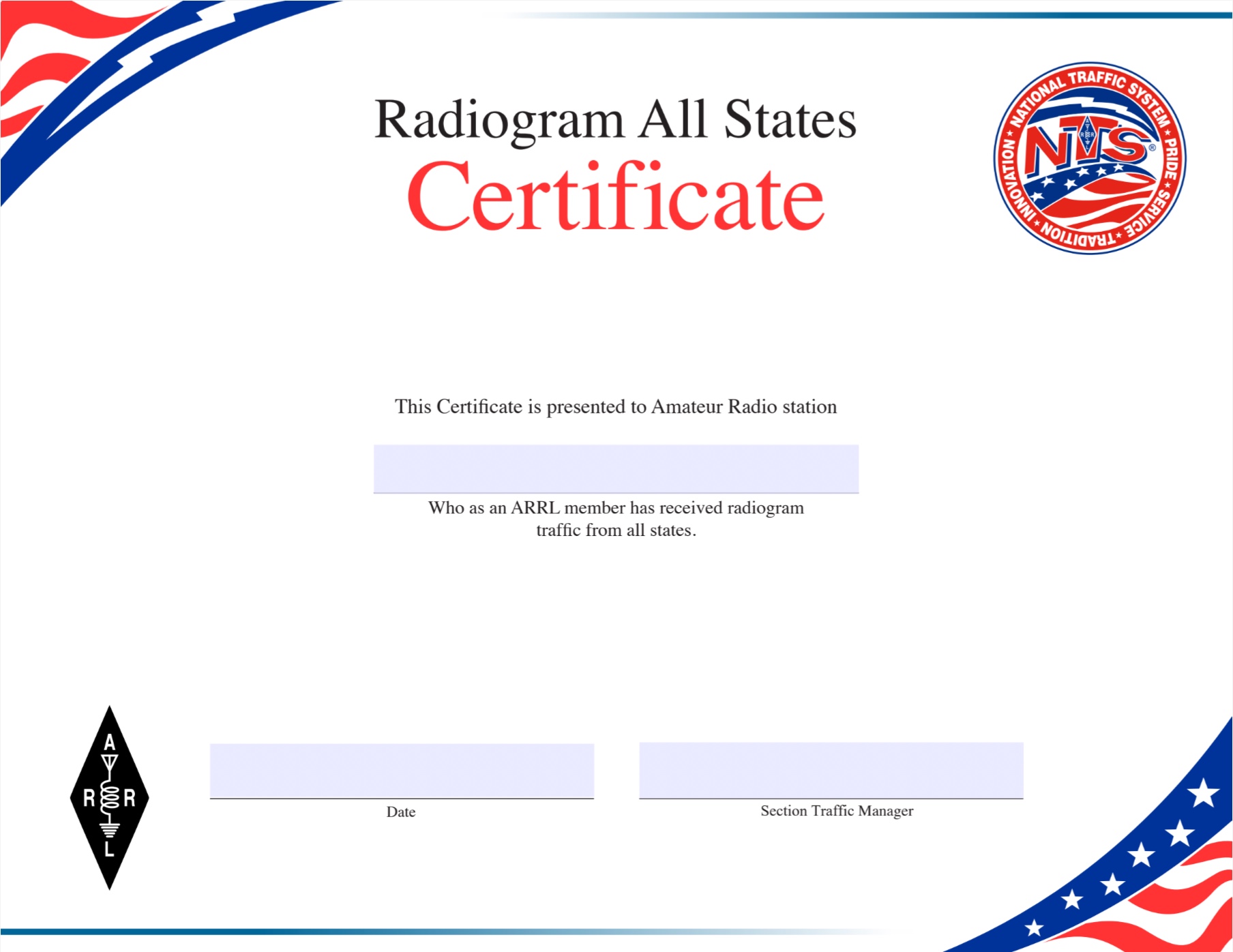 | Radiogram All States Certificate | ARRL member who has received radiogram traffic from all states | As stations qualify | Section Traffic Manager |
