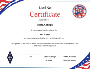 | Section Net Certificate | Regular participation in a Section traffic net | As stations qualify | Section Traffic Manager |